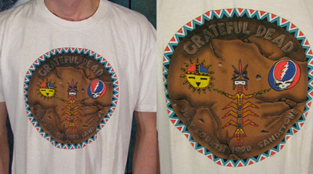 Ok, this is kinda fun - I found a vintage t-shirt on Ebay this morning. It's from the Grateful Dead show at Sandstone on July 4th 1990. The cool thing is that it appears to have been designed specifically for that show - it actually reads "Sandstone" along with the date on the front of the shirt. A little further googling revealed the band's set list for that show, along with some comments about the heat, Jerry Garcia wearing cut-off jeans, and a UFO sighting (!!!?). Anyone have further information on this?